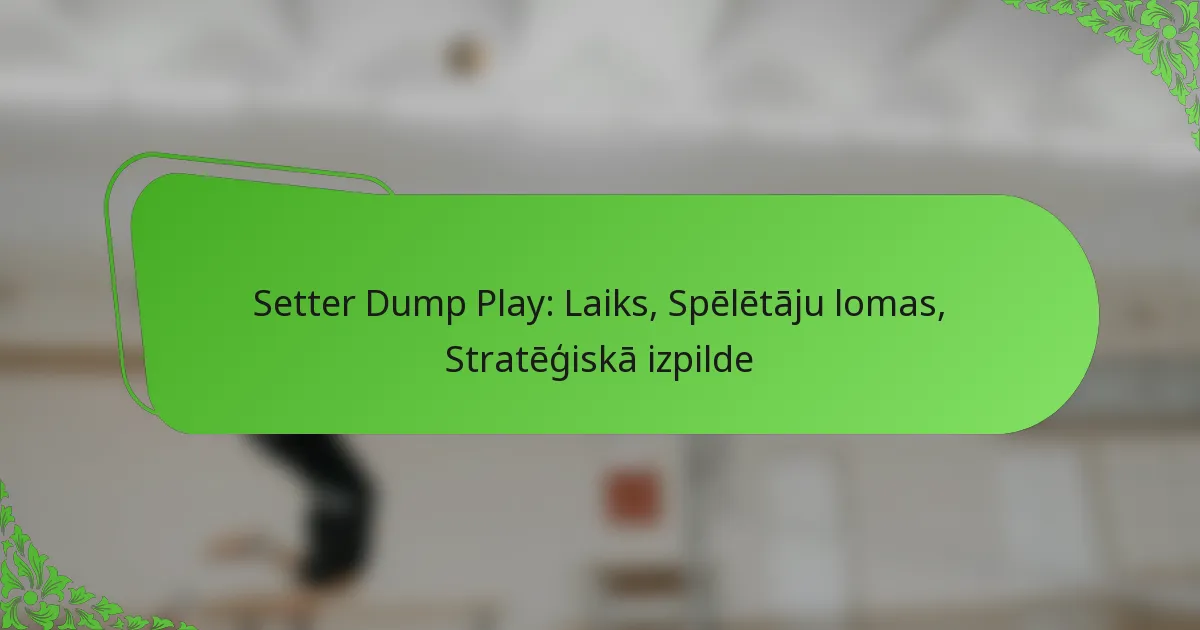 Setter dump spēle ir stratēģisks manevrs volejbolā, kurā setters uzņemas iniciatīvu un nosūta bumbu pāri tīklam, nevis uzstāda to uzbrucējam. Šis negaidītais solis var izmantot pretinieku aizsardzības vājās vietas, īpaši, kad tās ir neizvietotas, radot vērtīgas punktu gūšanas iespējas. Efektīva izpilde balstās uz skaidrām lomām setteram un citiem spēlētājiem, nodrošinot, ka komanda saglabā uzbrukuma momentumu un izmanto pārsteiguma elementu.